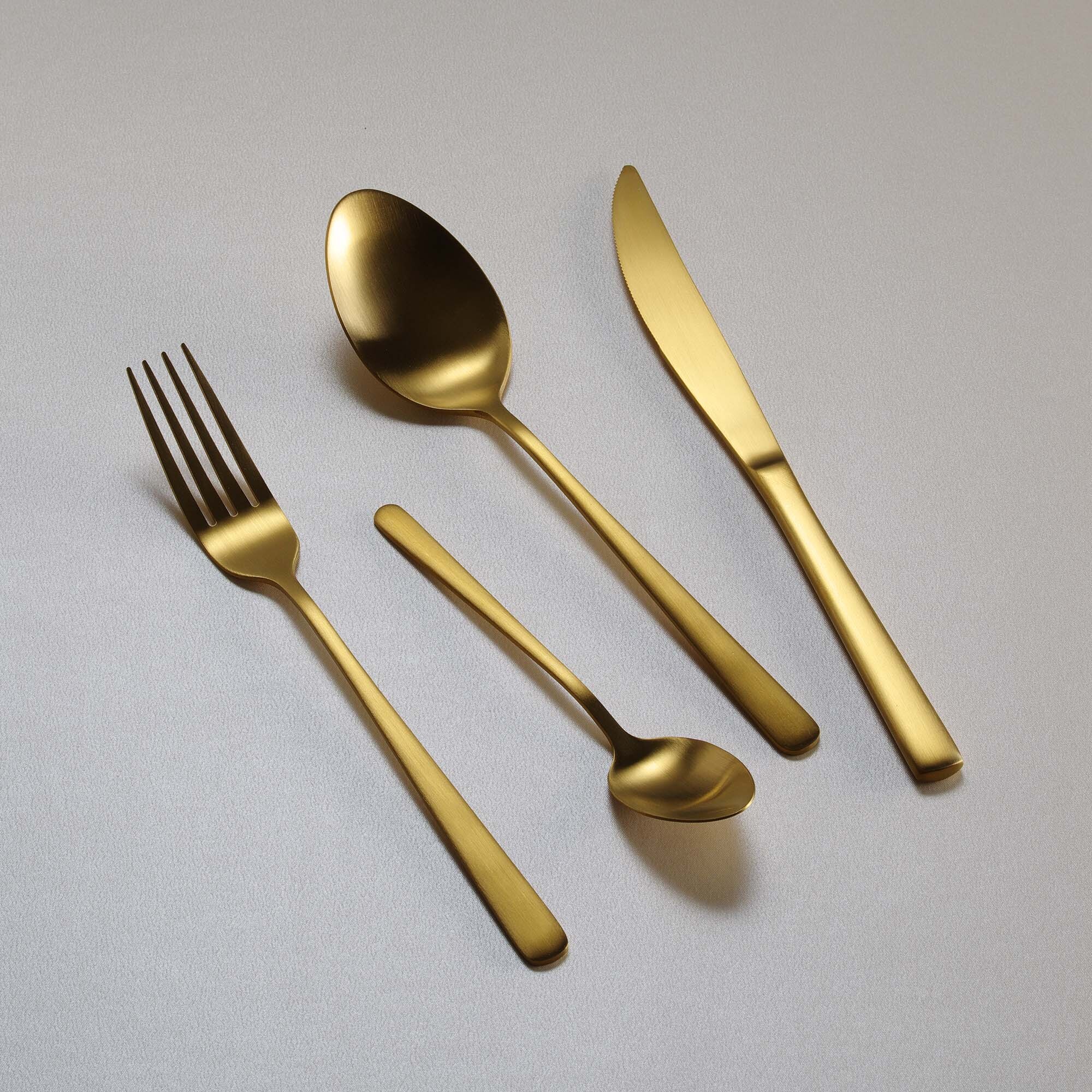 Zestaw sztućców Fjord Gold OVE w złotym, matowym wykończeniu PVD przeznaczony do restauracji, hoteli i cateringu. Wykonany ze stali 18/0 bez niklu, odpowiedni dla alergików.